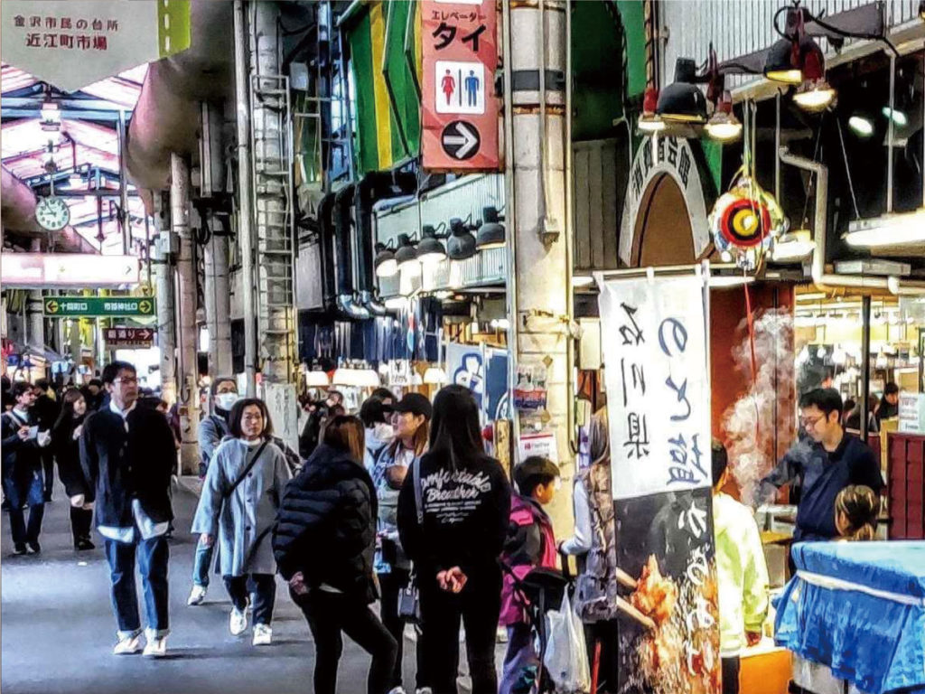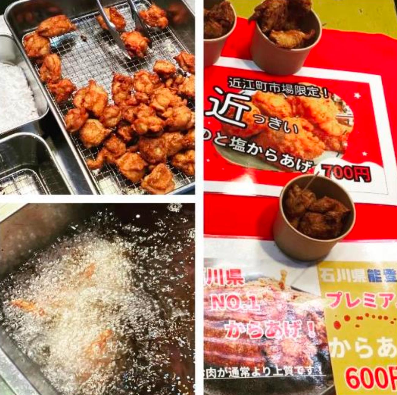現在は近江町市場の大口水産さんの協力のもとに出店させていただき、金沢の代表的な醤油である大野醤油、能登塩、ニンニク、生姜で鶏肉を味付けし片栗粉で揚げて「のと塩からあげ」として販売し1日で300食近く販売する人気商品となっています。(日祝日)